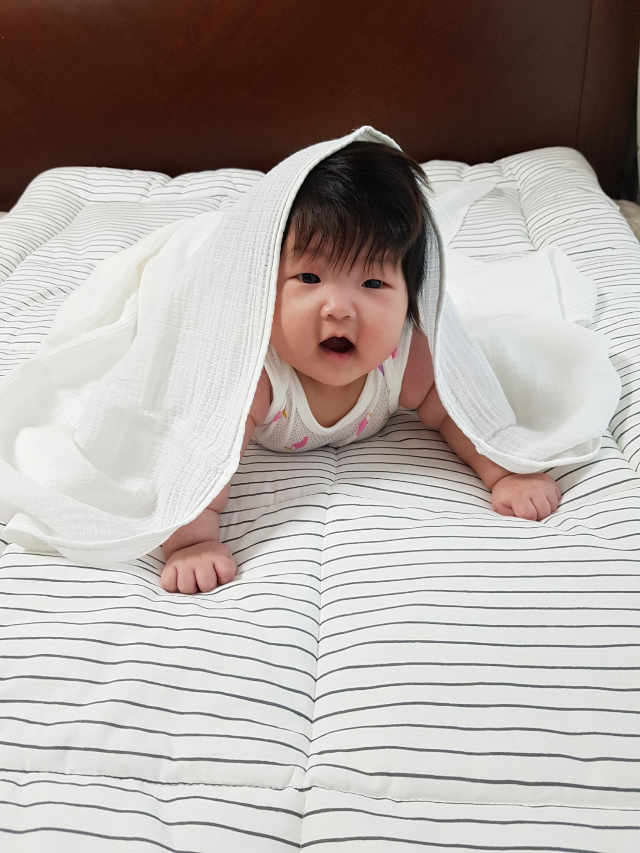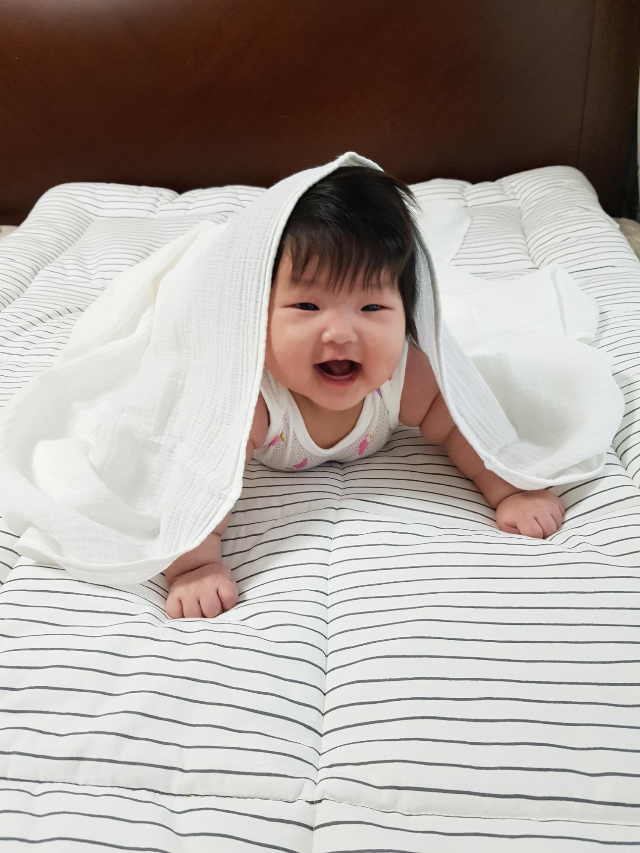 요즘 기온이 많이 올라 낮에 땀을 많이 흘리고 잘때도 땀을 많이 흘리는 효림이를 위해 꿀잠을 부르는 유트러스 신상 아기 토퍼를 준비해봤어요 ^^