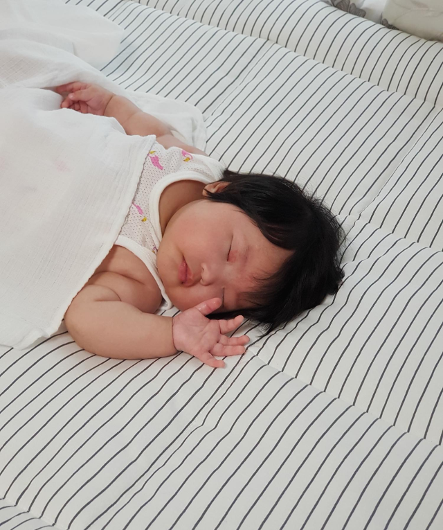 효림이와 저는 침대에서 같이 자는데 울 띵깡이는 유니클로 민소매 메쉬 바디슈트 입고 얇은 블랭킷 하나만 덮고 자요.